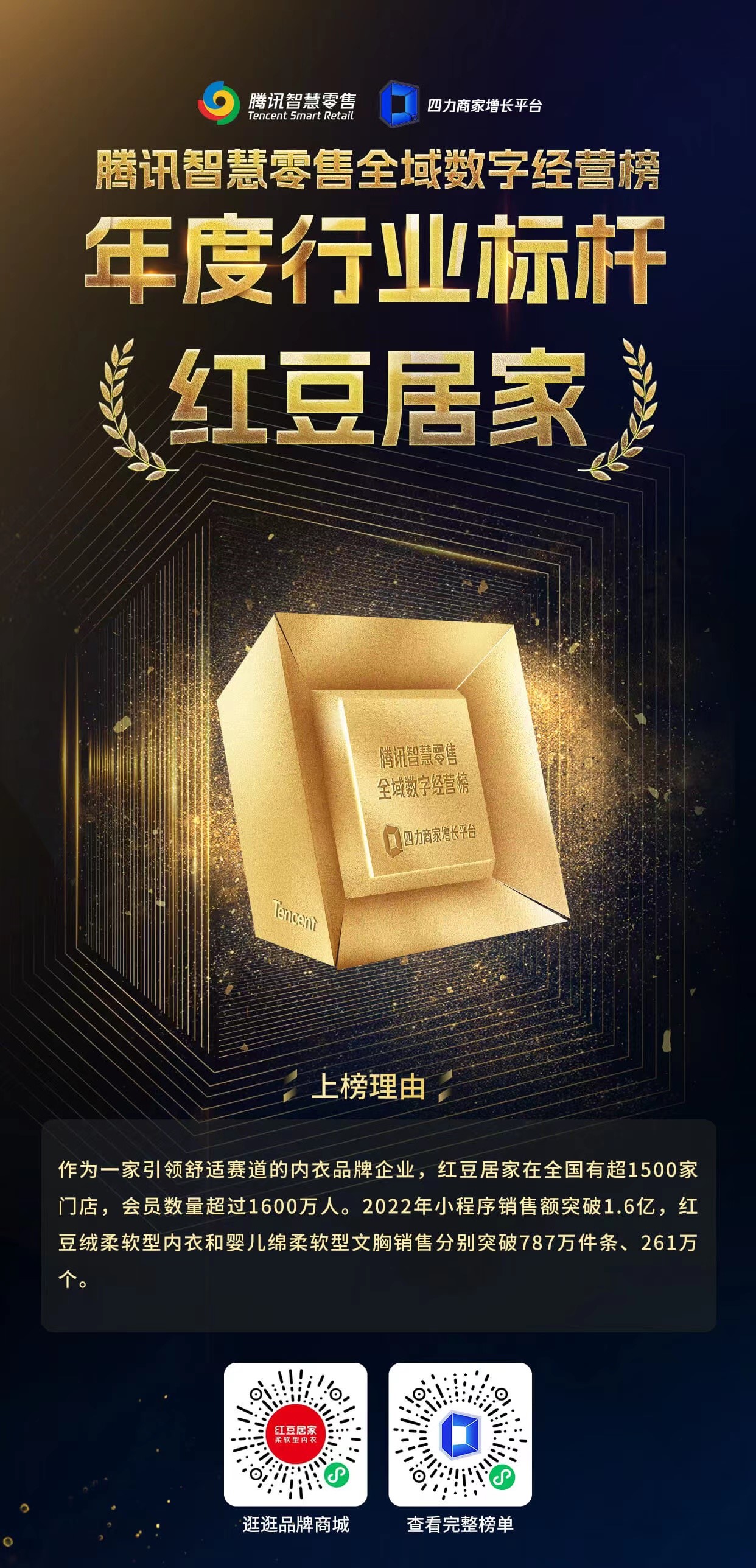 近日,由騰訊聯(lián)合《哈佛商業(yè)評(píng)論》中文版及多領(lǐng)域?qū)<?,大中華區(qū)艾菲等頭部機(jī)構(gòu)聯(lián)袂推薦,2022騰訊智慧零售全域數(shù)字經(jīng)營(yíng)榜發(fā)布。紅豆居家憑