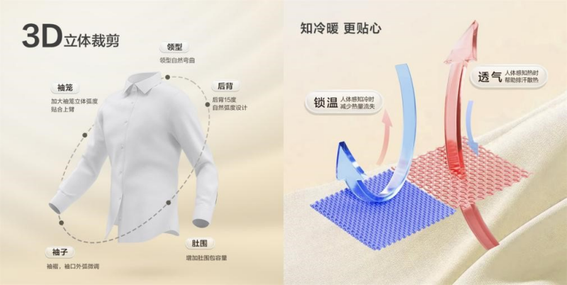 所謂0感,指的是“0壓、0皺、0摩擦、0束縛”。0感舒適襯衫首創(chuàng)紅豆超細(xì)旦纖維,輕如羽毛,彈性十足,透氣性極佳,即便炎炎夏日,也能感受到如沐春風(fēng)般的涼爽與自在。同時,創(chuàng)新運(yùn)用瑞士HeiQ智能控溫科技,讓面料擁有感知外界溫度并自動調(diào)節(jié)的能力,實現(xiàn)“熱縮冷脹”智能溫控效果,在任何環(huán)境下都能保持恰到好處的舒適。