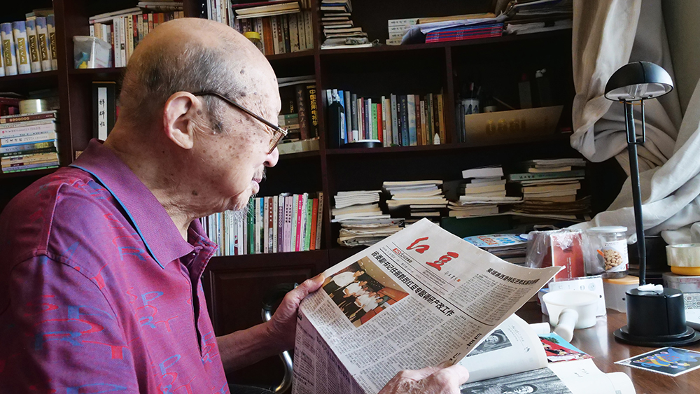 7月29日,今年的七夕前夕,當(dāng)代著名老詩人、作家、文藝評(píng)論家丁芒在家中認(rèn)真錄制著對(duì)紅豆七夕節(jié)20周年的祝福視頻。中國當(dāng)代詩壇曾有“北臧南丁”之說。丁芒,這位從南通城走出來的大詩人,從抗日戰(zhàn)爭的烽火開始生命的吟唱,80載筆墨為伴,書寫了萬余首激蕩人心的詩篇。面對(duì)記者的拜訪,丁芒和其夫人都十分熱情。現(xiàn)已96歲高齡的他,看起來依舊面色紅潤,精神飽滿。在丁芒老先生家中,能夠感受到濃濃的文化氣息,書柜上、書桌上擺滿了各種書籍。雖然已是耄耋之年,丁芒老先生依然每天以書籍為精神食糧,在他的身上,我們看到了一個(gè)詩人對(duì)詩詞的忠貞和熱愛,對(duì)傳統(tǒng)文化的敬畏和崇拜。